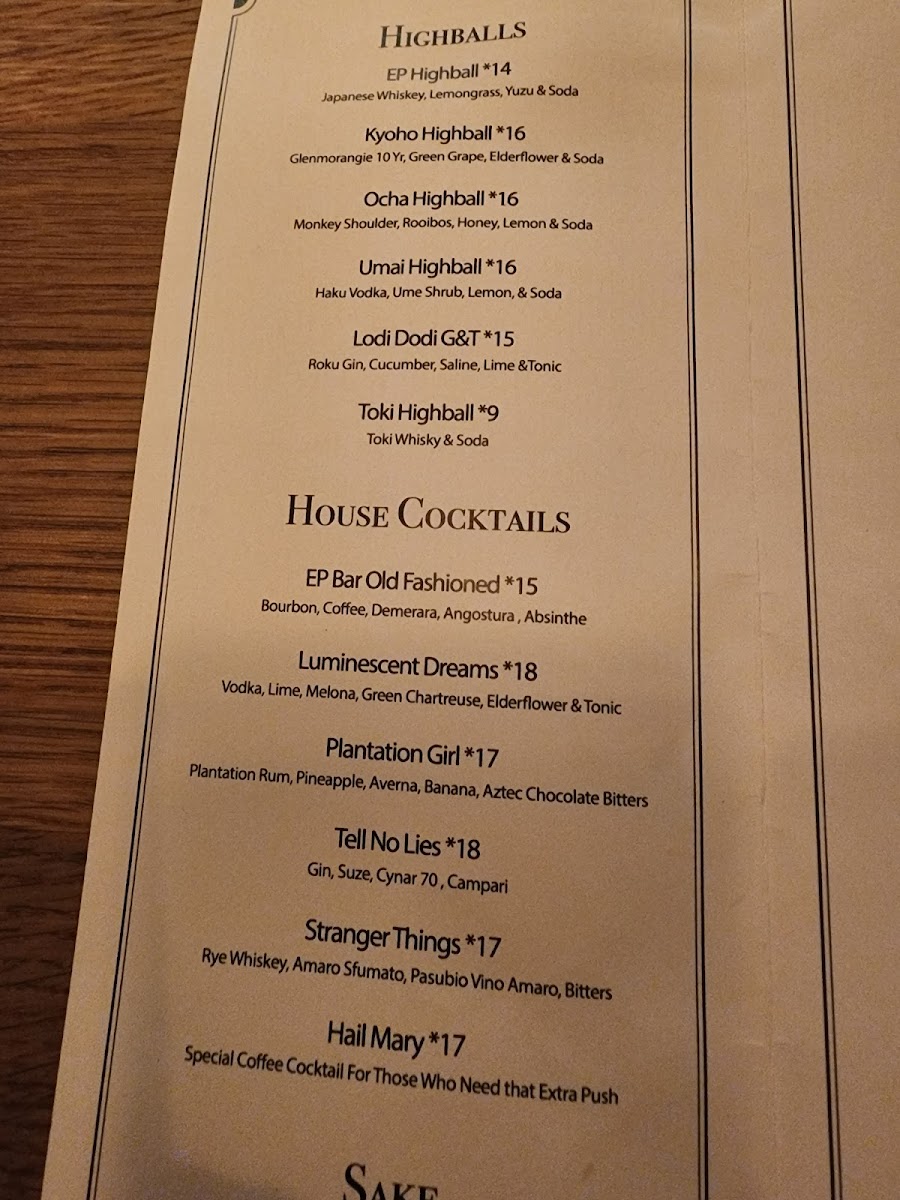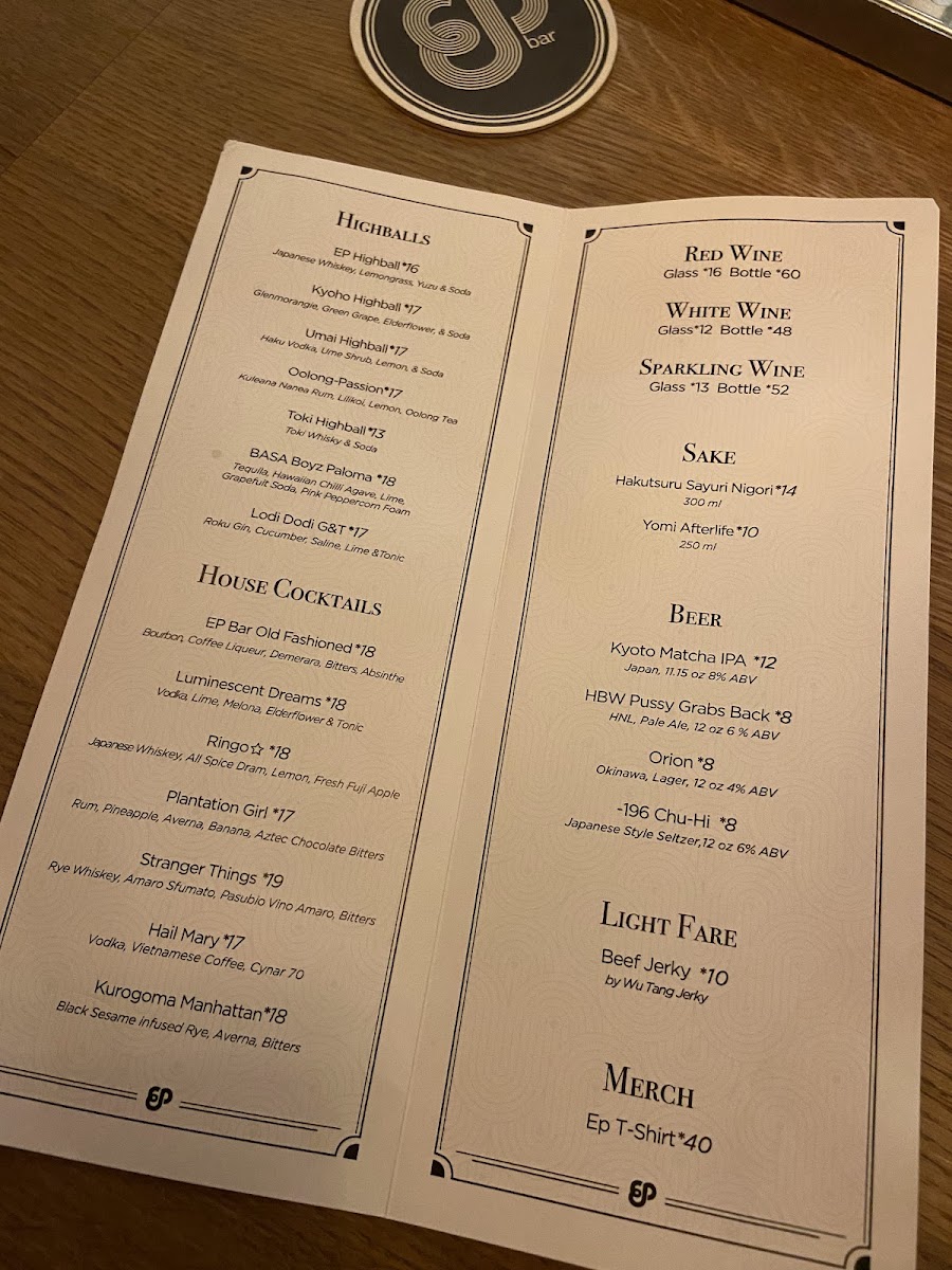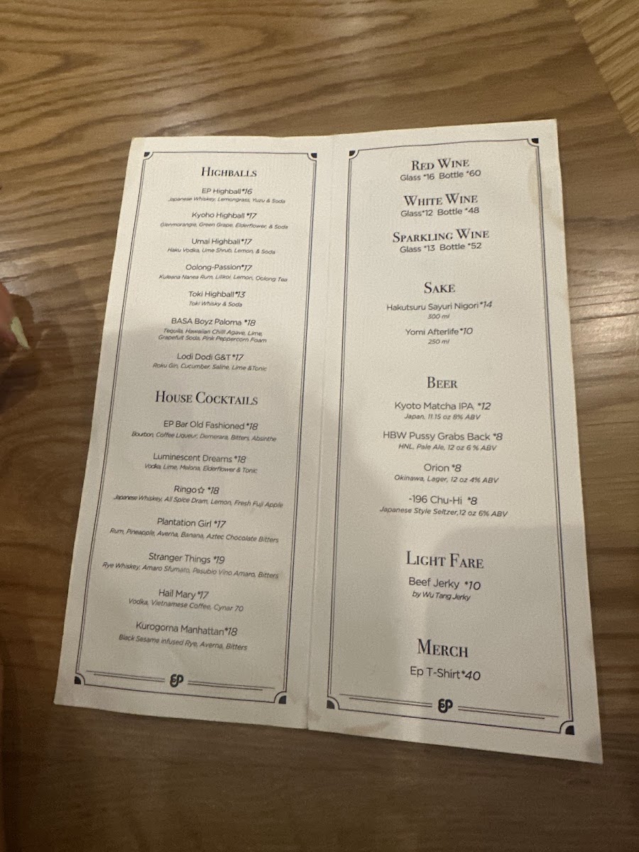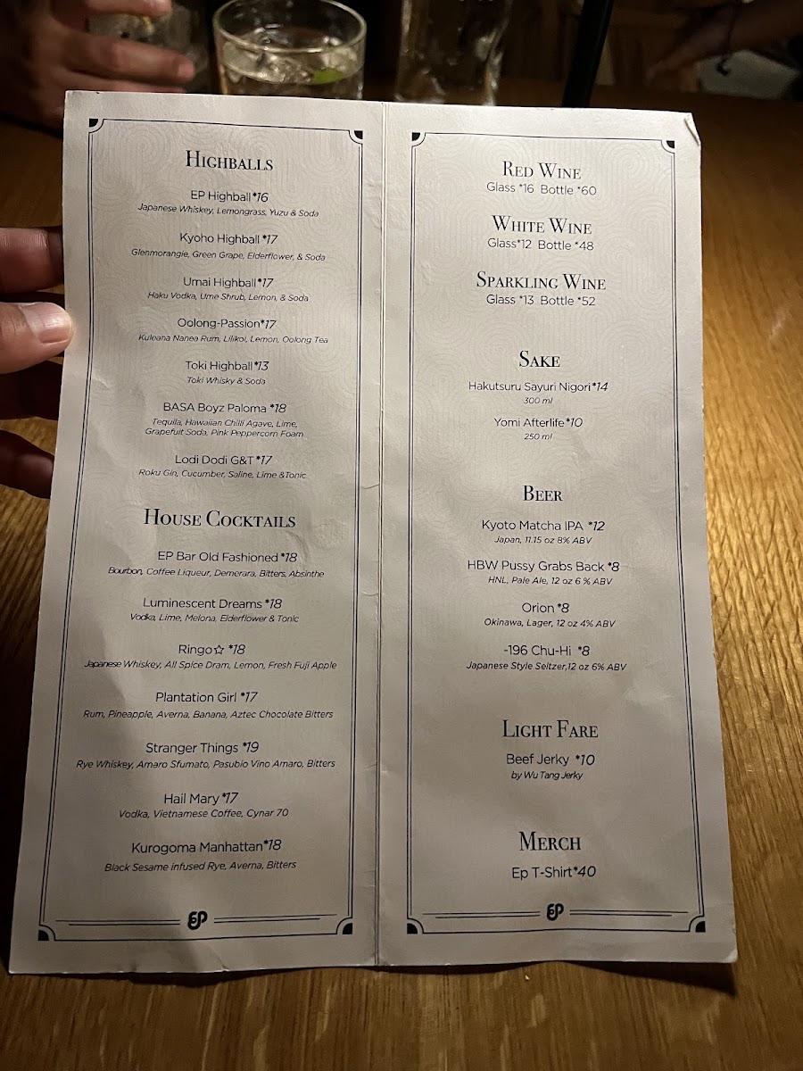 Welcome to EP Bar, a unique spot located at 1150 Nuuanu Ave in Honolulu, HI. This intimate bar offers an exceptional menu of cocktails crafted to tantalize your taste buds. Signature house cocktails like the EP Bar Old Fashioned and Hail Mary (Espresso Martini) set the tone for a delightful experience. For those inclined to explore wines, EP Bar features selections such as Domain Salvard Cheverny Blanc and Birichino Pet Nat.